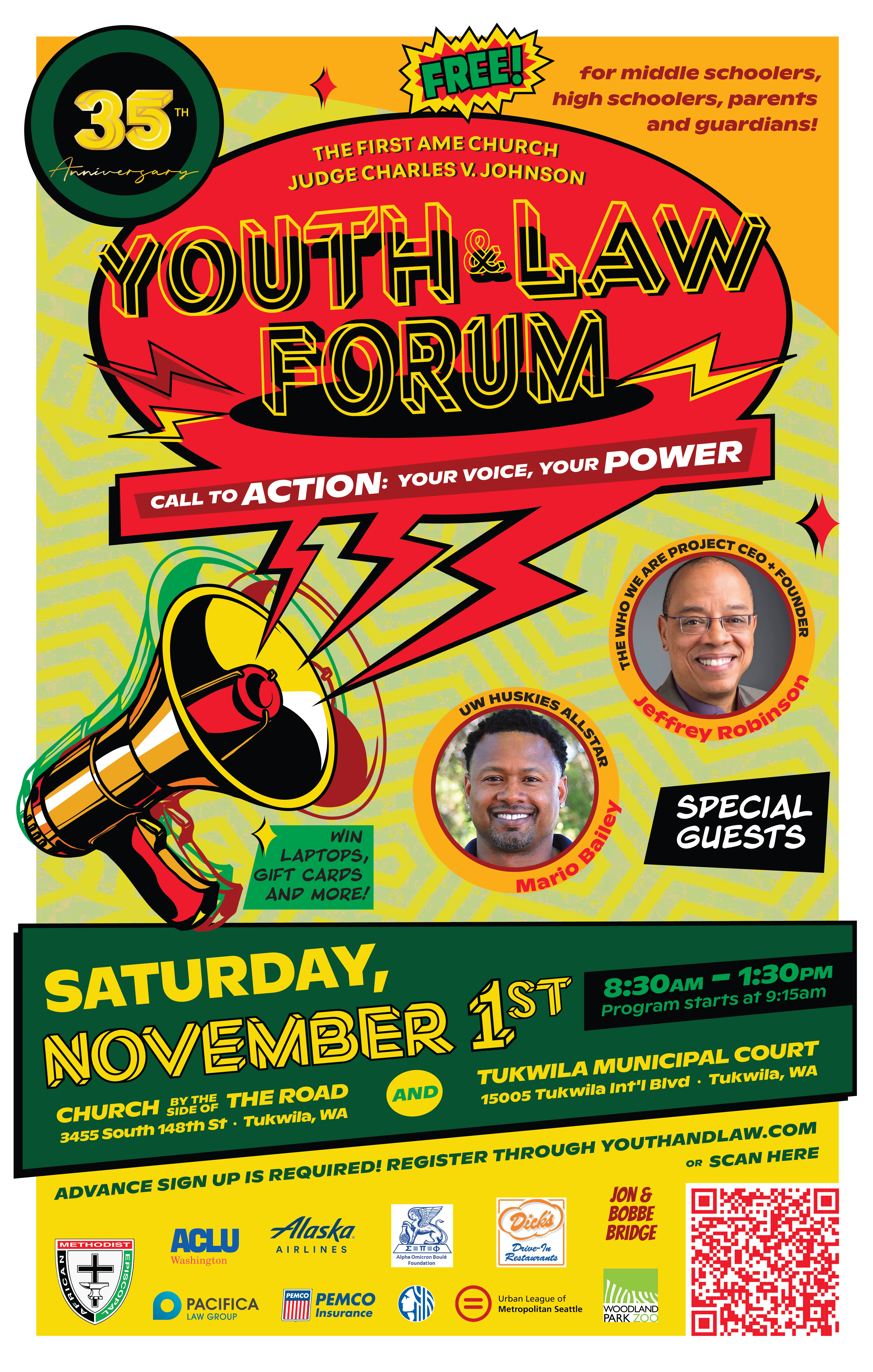 Come to the 35th Annual Youth and Law Forum! Free for middle schoolers, high schoolers, parents and Guardians. With Special guests Mario Bailey, UW Huskies Allstar, and Jeffrey Robinson, CEO and founder of The Who We Are Project. Win Laptops, Gift Cards, and More!