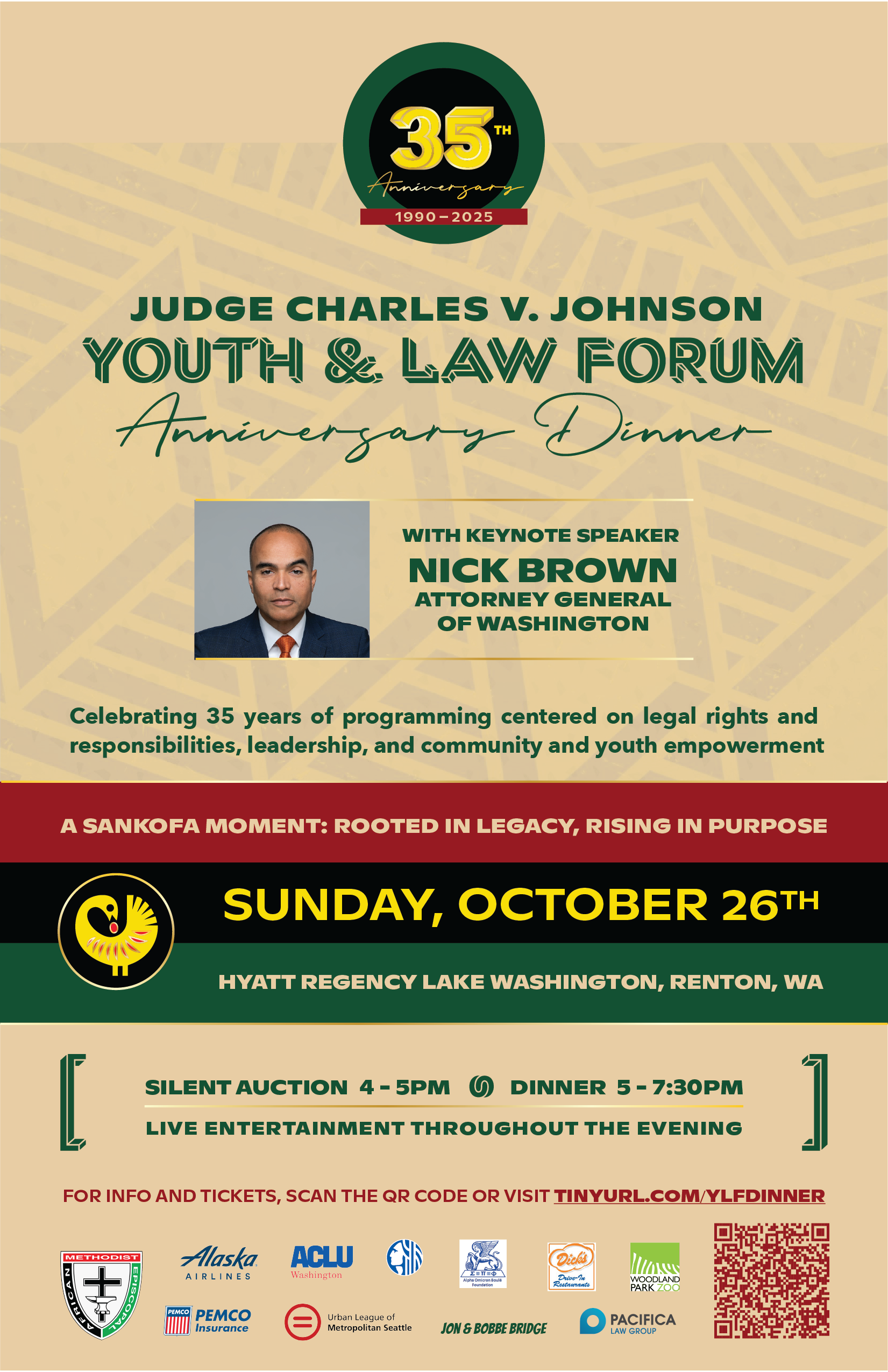 Celebrating 35 years of programming centered on legal rights and responsibilities, leadership, and community and youth empowerment. With keynote speaker Nick Brown, Attorney General of Washington